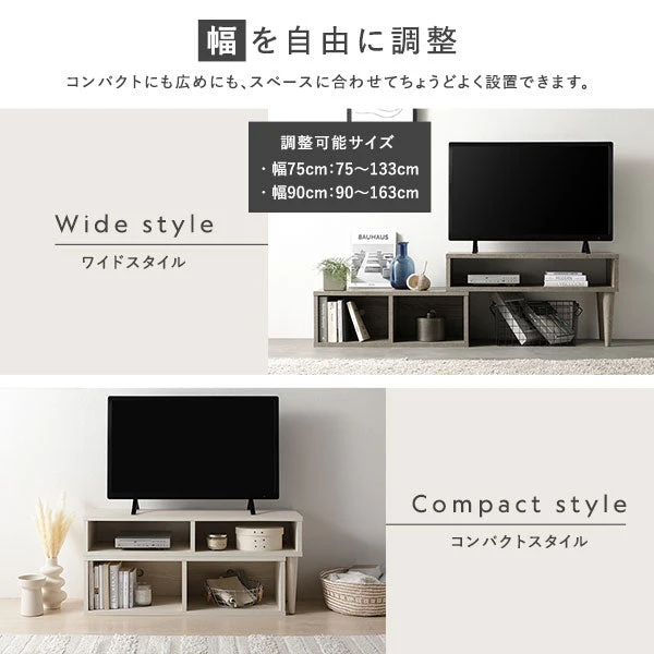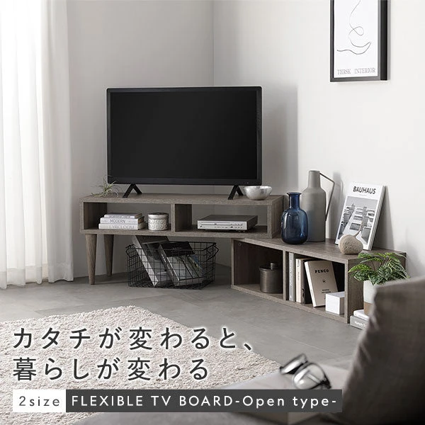 カラーバリエーションは4色。グレージュ 、 木目ホワイト 、 ナチュラル 、 ブラウン カタチが変わると 、 暮らしが変わる 2size FLEXIBLE TV BOARD - Open type 幅 ・ 角度 ・ レイアウト変更ができる「フレキシブル」テレビボード / 隠す×魅せる収納が可能 / 魅力的な質感とカラー お部屋に合わせて自由に変形可能 幅 、 角度 、 レイアウト変更が自由自在 幅を自由に調整(幅75cm:75~133cm 、 幅90cm:90~163cm) 角度を調整することでコーナースタイルのテレビ台にも変化。 天板の位置は簡単に左右に入れ替えでき 、 間取りに合わせて対応できます。 オープン収納を自由にアレンジ(75cm幅は5カ所のオープン収納を使って上手に自由にアレンジ可能。) オープン収納を自由にアレンジ(90cm幅は6カ所のオープン収納を使って上手に自由にアレンジ可能。) AV機器の収納に便利な上段スペース 下段は取り出しやすいオープン収納 天板上のスペースは魅せる場所へ 伸ばした分だけ収納スペースに 背面オープンで配線も簡単 テレビが見やすい高さ設計 リアルな質感を追求した表面材 カラーは質感をいかす4色の木目柄のバリエーション。 75cm幅 コンパクトなテレビサイズにおすすめ 90cm幅 安心の耐荷重で幅広いテレビサイズに対応 Details テレビ台としてだけではなく 、 様々な使い方ができます。リビングボードとして テレビ台としてだけではなく 、 様々な使い方ができます。メイクスペースとしても 組み立て手順 Size variation(75cm幅 / 90cm幅) サイズ詳細 伸縮テレビボード オープンタイプ 75~133cm幅 グレージュ 伸縮テレビボード オープンタイプ 75~133cm幅 木目ホワイト 伸縮テレビボード オープンタイプ 75~133cm幅 ナチュラル 伸縮テレビボード オープンタイプ 75~133cm幅 ブラウン 高品質で低価格をあたりまえにする。 説明画像32 説明画像33