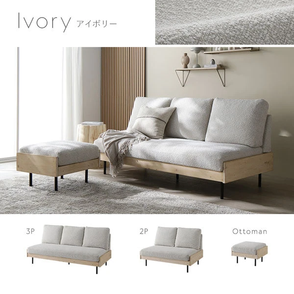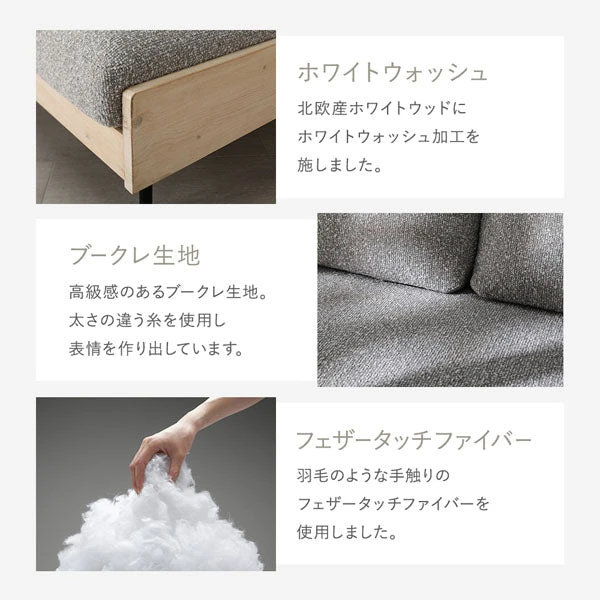 空気を含むブークレ生地のやわらかな凹凸は、触れるたびに心地よく、長く座っていても肌離れがよい穏やかな座り心地へ導きます。フェザータッチファイバーは沈み込みすぎない弾力で体圧を受け止め、読書や映画鑑賞などのくつろぎ時間をゆったり支えます。天然木ホワイトウォッシュの明るい木目は空間に軽さを与え、北欧テイストのやさしい雰囲気を演出。質感・座り心地・見た目のバランスに配慮した設計で、日々のリビングを心地よい居場所に整えます。