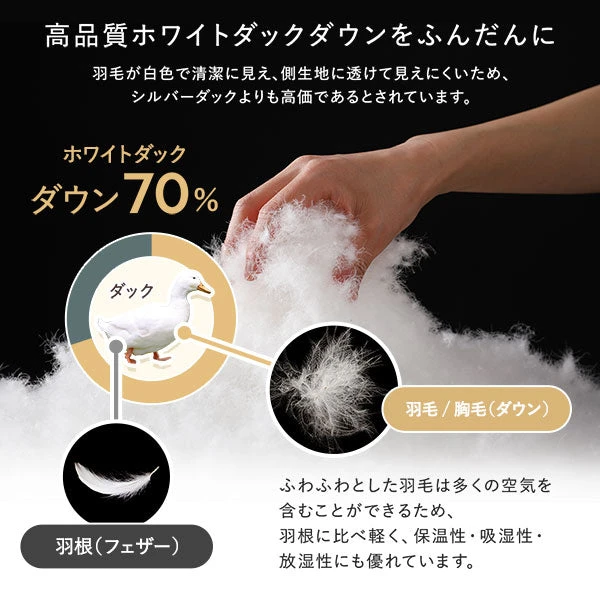 上品でやわらかな触感が素肌に心地よく、ふっくらとした膨らみが空気を含んで快適な温もりを維持します。毎日の眠りに上質感を添え、くつろぎの時間を豊かにします。心地よさが長く続きます。