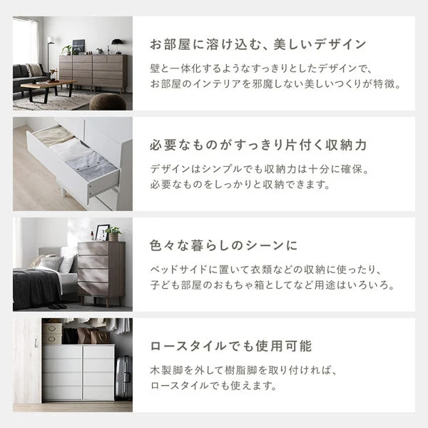 直線的で端正なデザインに、迷わず片づく仕分け設計を合わせた木製チェストです。よく使う物は手の届く位置に、季節物は見通しよく収められる内寸計画で、出し入れの無駄を減らし散らかりを予防します。触れるたび心地よい表面はお手入れも簡単。置き場所を選びにくい佇まいで空間になじみ、日常の動線を乱さずにすっきりとした景色が続きます。暮らしのリズムが整い、掃除や身支度の時間も短縮できます。