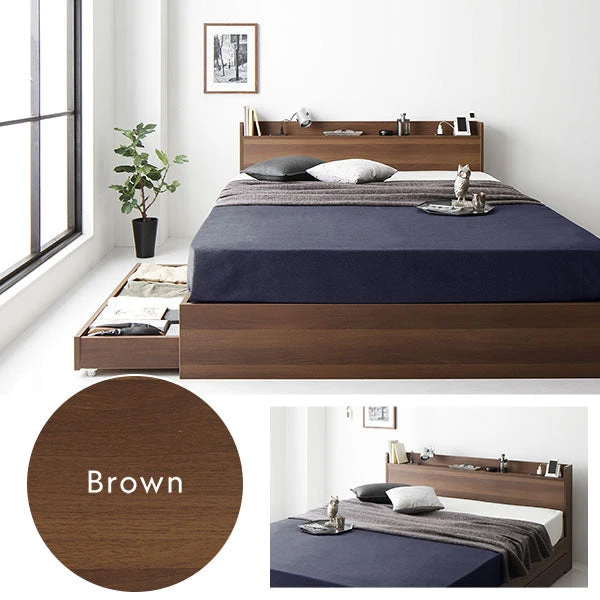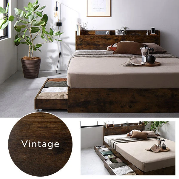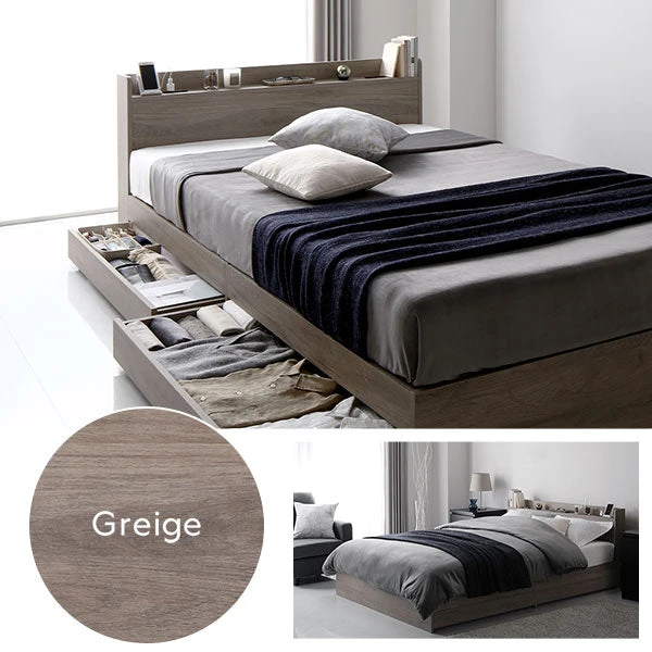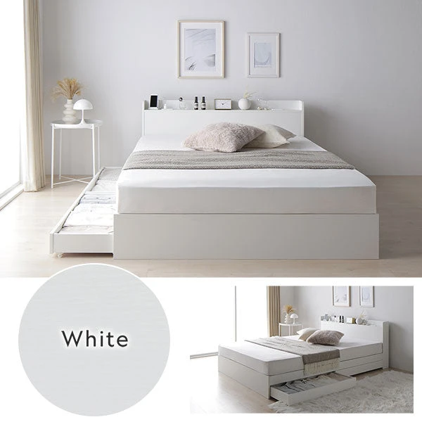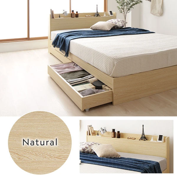 枕元には小物を置ける棚と電源口を用意し、寝前の充電や目覚ましの設置がすっきり収まります。足元側には可動しやすい引き出しを二杯備え、衣類やリネンを分けてしまえるため、取り出しが直感的で片付けが続きます。可動部は静かに動くつくりで夜間でも気兼ねなく扱え、しっかりした構造が日常使いの負荷に応えます。限られた空間でも通路を確保しやすい設計で、掃除の手間も少なく保ちやすい一台です。
