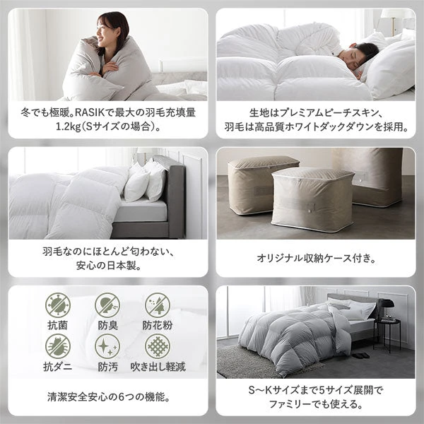 羽毛が均一に行き渡るよう配慮し、ふくらみを保ちながら体に沿ってフィット。就寝中の動きでもあたたかさをキープし、朝まで快適な環境づくりを助けます。