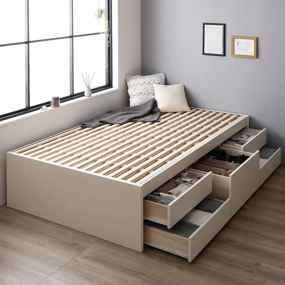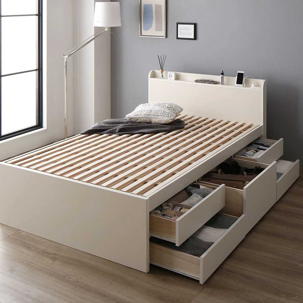 通気を保ち引き出し五杯で整う日本製の収納付きベッド セミシングル(ショート丈) ホワイト フレームのみ ヘッドレス