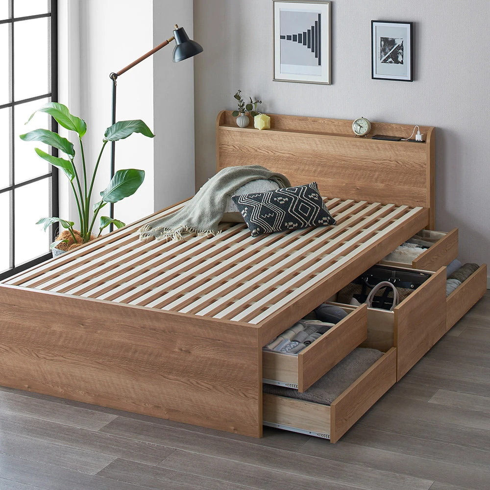 通気を保ち引き出し五杯で整う日本製の収納付きベッド セミダブル シャビーオーク フレームのみ 棚付き