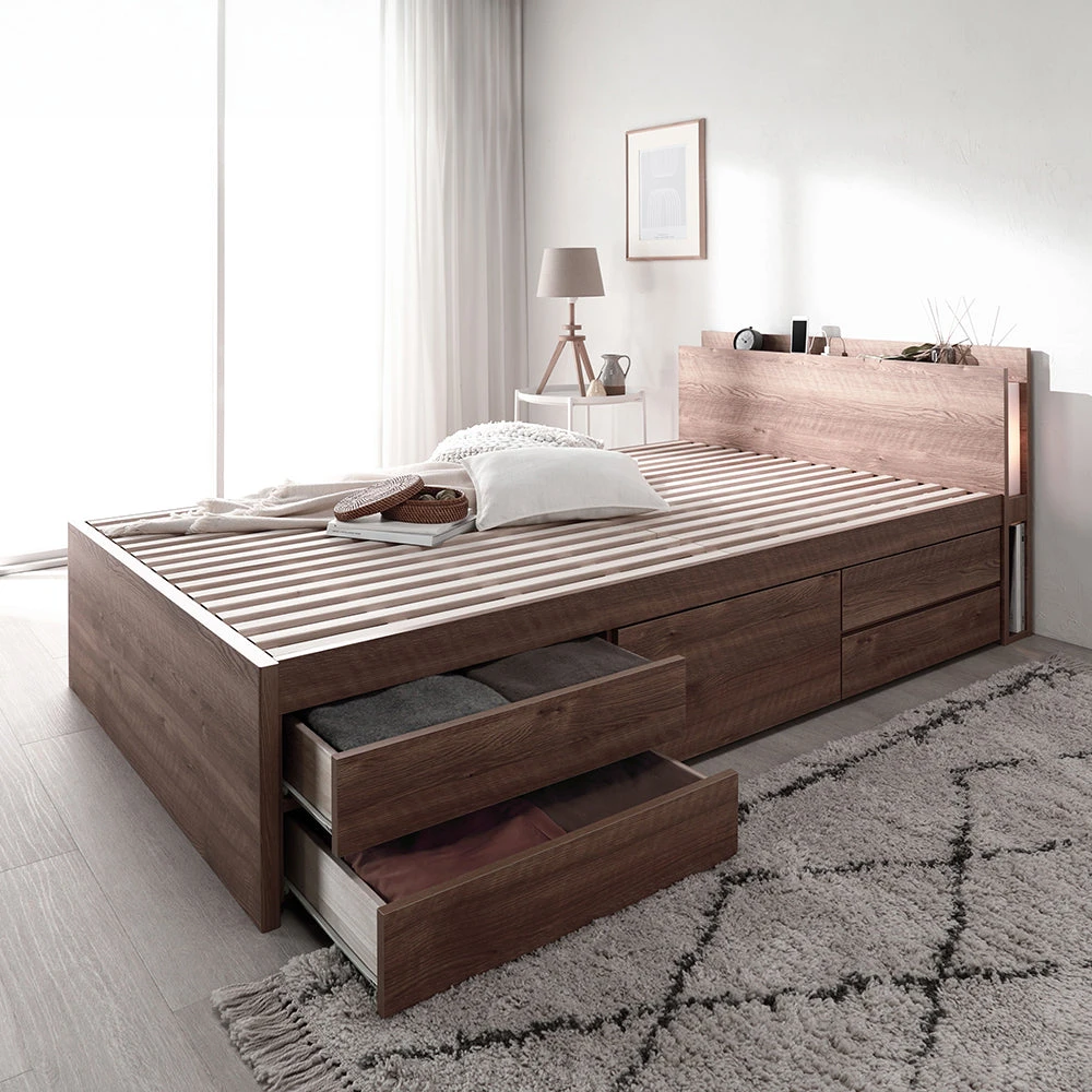 通気を保ち引き出し五杯で整う日本製の収納付きベッド セミダブル シャビーオーク フレームのみ 照明付き