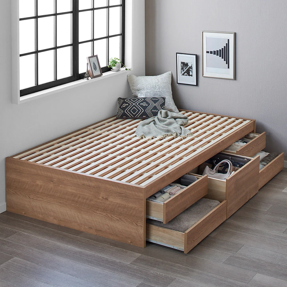 通気を保ち引き出し五杯で整う日本製の収納付きベッド セミダブル シャビーオーク フレームのみ ヘッドレス