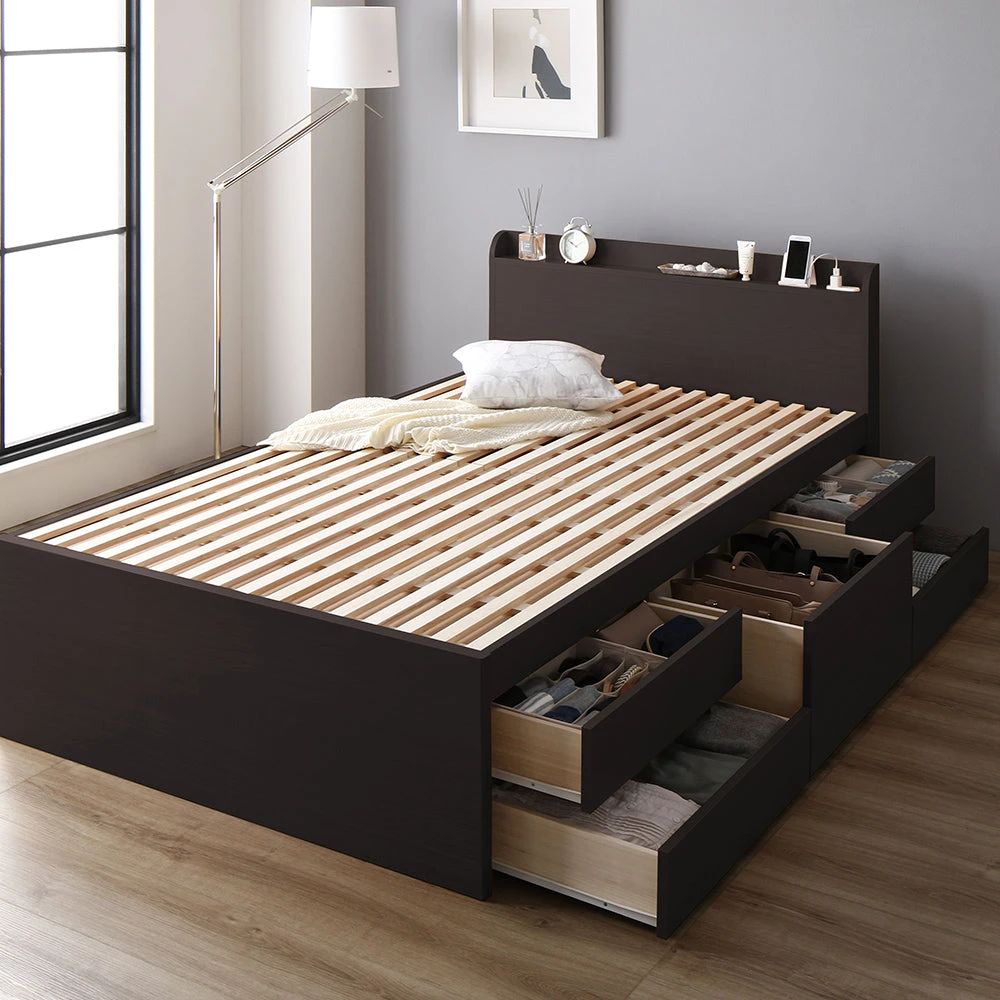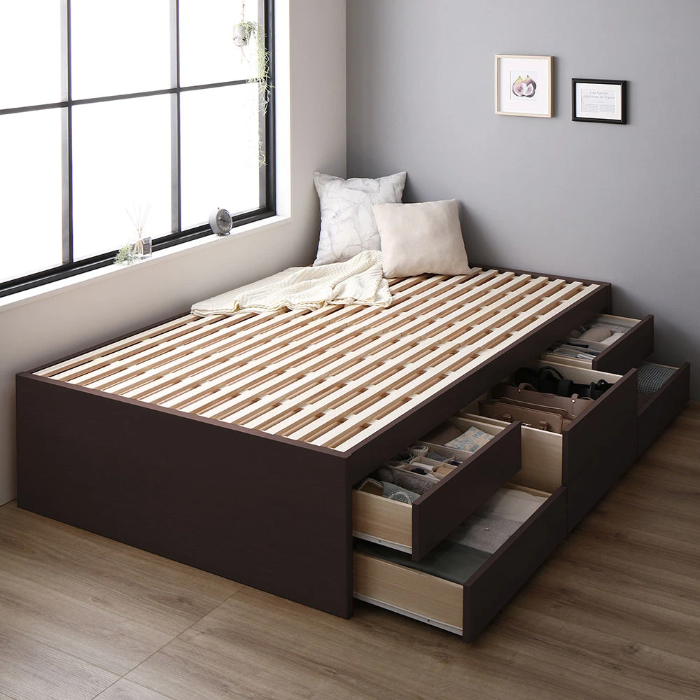 通気を保ち引き出し五杯で整う日本製の収納付きベッド セミシングル(ショート丈) ブラウン フレームのみ ヘッドレス