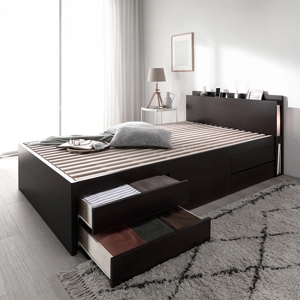 通気を保ち引き出し五杯で整う日本製の収納付きベッド セミシングル(ショート丈) ブラウン フレームのみ 照明付き