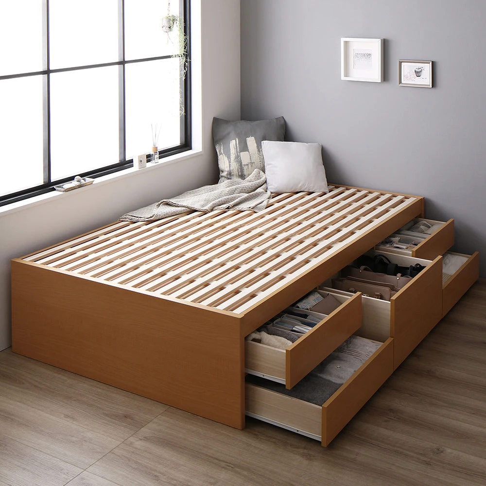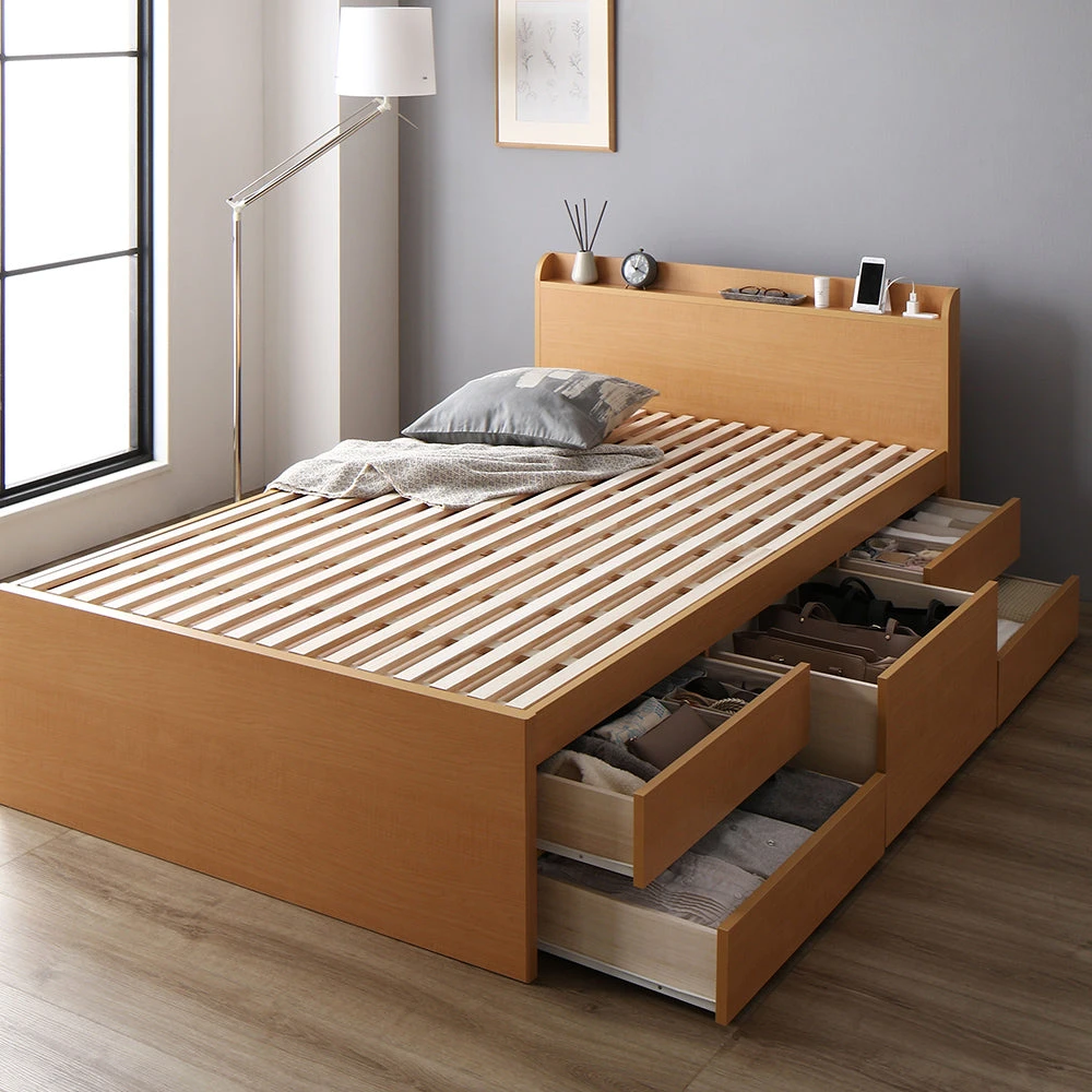 通気を保ち引き出し五杯で整う日本製の収納付きベッド セミシングル(ショート丈) ナチュラル フレームのみ ヘッドレス