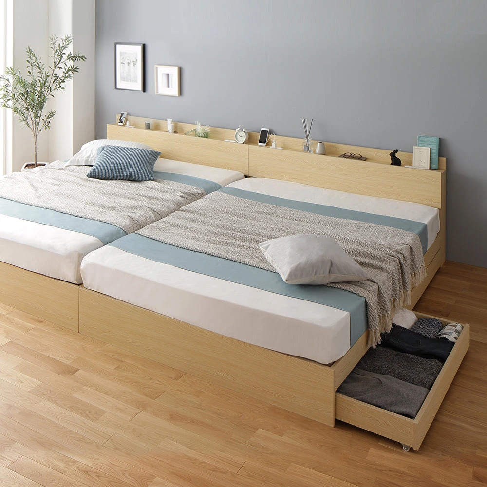 使う物を近くにしまえて床面を広く保てる収納付きベッド ワイドキング200cm(S+S) ナチュラル 国産ポケットコイルマットレス付き(レギュラー)