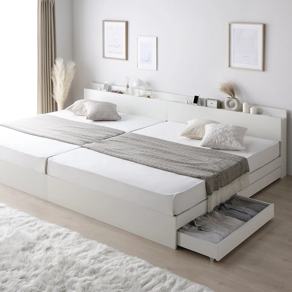 使う物を近くにしまえて床面を広く保てる収納付きベッド ワイドキング200cm(S+S) ホワイト ベッドフレームのみ
